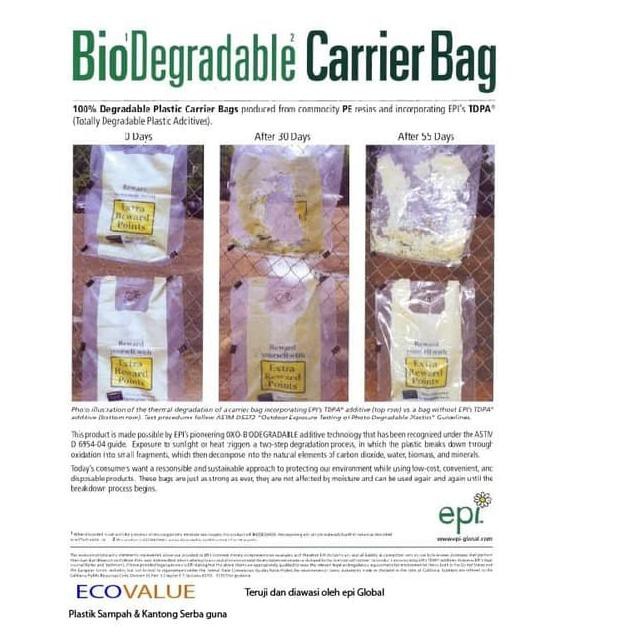 Plastik Sampah Ramah Lingkungan Ecovalue Sedang 60X100Cm (9 Lmbr)Plastik Sampah Ramah Lingkungan Ecovalue sangat baik digunakan untuk rumah tangga, dan Usaha Anda. Terbuat dari bahan essence ramah lingkungan EPI 1%, memungkinkan plastik dapat berdegeradssi sendiri, dan tidak menjadi masalah untuk Lingkungan.Selain itu, Plastik ukuran besar , ini dapat digunakan untuk mengangkut benda berat dan daya tampung cukup banyak, keunggulan sebagai berikut :- Tidak bau- Tidak mudah robek atau jebol- Kapasitas daya tampung bisa maximal 50liter- Daya angkung maximal 30 kg- Effiency dalam loading dan meloading barang,Ukuran :Panjang 60 cm x Lebar 100 cm x Tebal 40 mikronPilihan lain plastik sampah Ecovalue Kecil 40x 45 cm , 60 x 100 cm, 50 x 75cm dan Extra besar 120 x 150 cmEcovalue sudah menjadi brand Ambassador untuk plastik sampah ramah lingkungan dengan addive epi.BUDAYAKAN MEMBACA SEBELUM MEMBELI :*) Pemilihan warna & ukuran hanya melalui kolom "KETERANGAN/CATATAN" saat order, bukan melalui CHAT & DISKUSI.*) Wajib mendokumentasikan saat membuka paket dalam bentuk video untuk berjaga-jaga jika ada barang yang tidak sesuai /rusak/cacat sebagai syarat retur di toko kami*) Jika anda memutuskan untuk MEMBELI maka kami anggap anda SETUJU dengan aturan di atas*) TIDAK MENERIMA RETUR & KOMPLAIN DALAM BENTUK APAPUN***** Baca Catatan Wajib Dibaca Sebelum Transaksi ********** Cek Stock sebelum Order ********** Produk yang telah dibeli tidak dapat dikembalikan ********** TIDAK MENERIMA RETUR & KOMPLAIN DALAM BENTUK APAPUN ******NB : Mohon untuk konfirmasi atau menambahkan ulasan apabila barang sudah sampai ditangan pelanggan. Happy Shoping !!