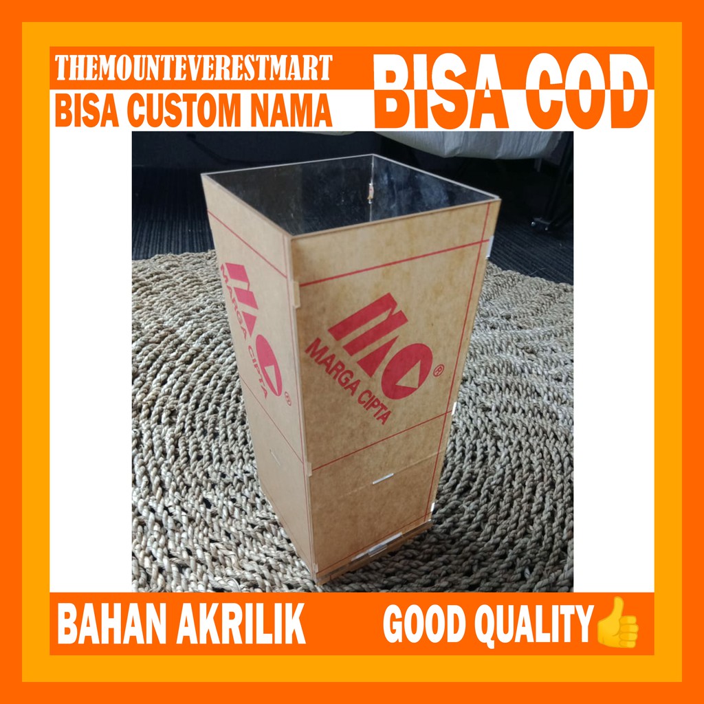 Cara check out :1. Infokan ukuran panjang, lebar dan tinggi box yang diinginkan di chat, beserta logo atau tulisan yang diinginkan.2. Seller akan membuatkan desainnya.3. Seller akan memberikan desain kepada customer untuk di acc.4. Setelah customer acc desain, seller akan membuat harga untuk produk tersebut.5. Customer check out berdasarkan nama.Bahan : akrilik bening 2mmLogo digrafirBisa request ukuran, logo, nama, tulisan, nomo