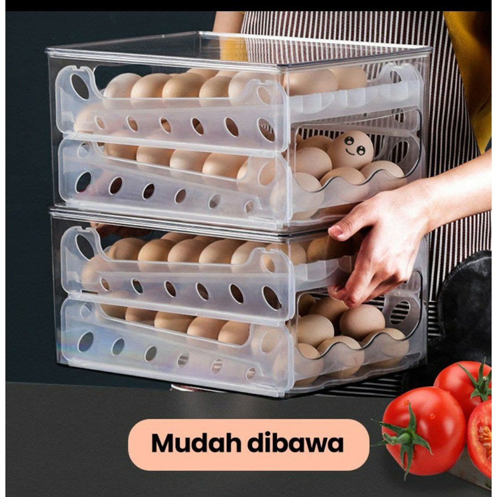 Tempat Telur Portable 2 Susun Rak Tempat Penyimpanan Telur OtomatisMODEL BARU - RAK TELUR GELINDING SENDIRI TANPA HARUS BUKA PENUTUP NYA ATAU GESER-GESER Rak penyimpanan telur ini berbahan plastik tebal yang kokoh dan ringan, tahan lama. Model yang cantik sehingga penyimpanan telur rapih, teratur, mudah dijangkau.Keunggulan Produk : - Berbahan plastik extra tebal lebih tahan lama dan kokoh. - Bukaan untuk tangan luas - Model cantik & gak kaku - Dapat ditumpuk, lebih hemat tempat dan kapasitas besar - desain telur dapat gelinding sendiri tanpa harus membuka atau menggeser penutup nya. - memudahkan pengambilan telur - Akses penyimpanan dan pengambilan sangat mudah dan nyaman - Desain handle hand yang nyaman ditarik pada saat rak ditumpuk Ukuran Produk : 32cm x 24cm x 16cmBahan : Acrylic & PlastikWarna : Putih BeningDeskripsi produk: 1. Kotak penyimpanan telur yang praktis 2. Terbuat dari plastik yang aman untuk makanan 3. Menjaga telur tetap higienis dan bersih 4. Cocok digunakan untuk kulkas tanpa tempat telur 5. Berkualitas t