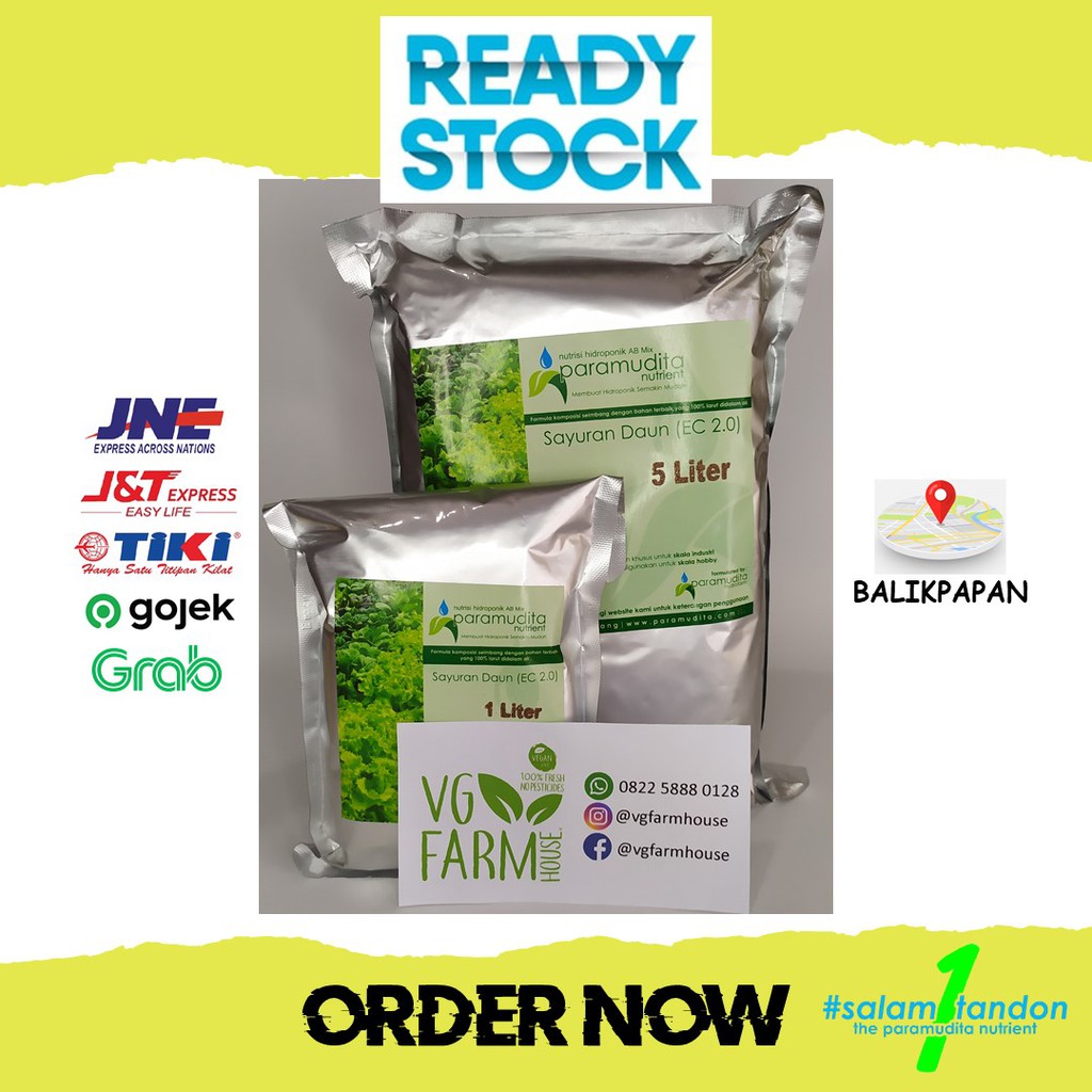 "Deskripsi AB Mix Sayur Daun 5 Liter | PARAMUDITA NUTRIENT Nutrisi HidroponikNutrisi Hidroponik khusus untuk Sayuran Daun, baik untuk Sawi-sawian, Selada/Lettuce, Kangkung, Bayam, dan lain lain. Komposisi formula yang kami sesuaikan secara khusus untuk kebutuhan tanaman dan kami design secara khusus untuk Skala Industri Hidroponik agar para peng-hobby hidroponik, tidak akan pernah kesulitan menggunakan Paramudita Nutrient, dan akan mendapatkan hasil yang lebih maksimal.Dengan komposisi yang ada didalam Paramudita Nutrient, memungkinkan industri Hidroponik untuk menanam berbagai jenis tanaman yang berbeda (misal: sawi sawian dan selada), dan usia tanam yang berbeda (mulai dari semai, remaja sampai dengan masa panen) yang selama ini diyakini memiliki perbedaan dalam setting kepekatan nutrisi, menjadi hanya dengan 1 tandon air nutrisi dengan kepekatan cukup tinggi (sampai batas tertentu, silahkan hubungi kami untuk keterangan lebih detail) tanpa adanya masalah seperti tip burn/terbakar ujung daunnya, dan formula ini sudah kami uji di banyak tempat diseluruh Indonesia.Paramudita Nutrient hadir untuk membuat Hidroponik menjadi lebih mudah dan murah. Now Everyone Can Grow Hydroponic !!Spesifikasi Nutrisi :EC 2,0 / 1000ppm (Bila dicairkan dengan air sesuai dengan kemasan).Anjuran Pemakaian Nutrisi Sayur Daun :TDS / EC : 1.200 ppm / EC 2,2-2,4 (Dimulai sejak Hari Pertama Semai sampai dengan Panen).Range pH Ideal : 6,0 - 6,3Why Paramudita Nutrient?https://www.youtube.com/watch?v=HDh_apZMOE0Cara melarutkan:https://www.youtube.com/watch?v=cHeQTZ-IMBUIngin belajar lebih dalam tentang Hidroponik ?Bari bergabung di Komunitas Facebook Paramudita Community dan Channel Youtube kami Paramudita
