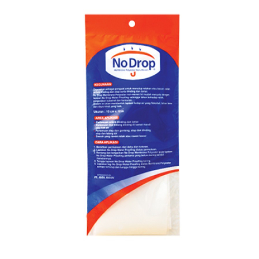 No Drop Membrane No Drop Membrane digunakan sebagai penguat untuk menutup retakan atau bocor. No Drop Membrane mudah menyatu dengan lapisan No Drop Cat Pelapis Anti Bocor sehingga tahan terhadap retak, pergerakan substrat dan benturan. Sistem ini akan membentuk lapisan kedap air yang fleksibel, tahan lama dan daya rekat yang baik.UKURAN Lebar x Panjang = 10 Cm x 10 MeterKEGUNAAN DAN KEISTIMEWAAN-Penguat untuk menutup retakan/ bocor-Mudah menyatu dengan No Drop Pelapis Anti Bocor -Tahan terhadap retak, pergerakan substrat, dan benturan-Berdaya lekat tinggi-Tidak beracun -Kedap air-Tahan air