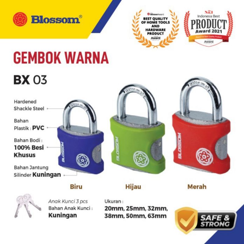GEMBOK WARNA 32 MM BLOSSOMGembok Warna Anti MalingMerk : BlossomFungsi : Koper/kotak penyimpananBahan / Material Leher : BesiBahan / Material Lubang Kunci (Jantung / Silinder) : KuninganBahan / Material Badan : PVCUkuran : 32mmTipe Leher: PendekTipe Anak Kunci : biasa bahan besi (3