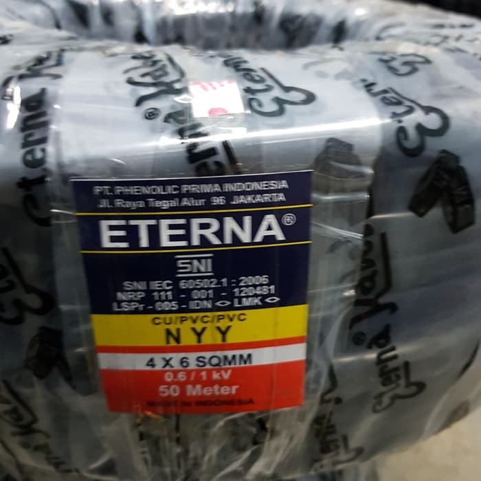BELI PRODUK RESMI KABEL ETERNA HANYA DI DISTRIBUTORKABELKabel eterna nyy 4x6 @50m 4x6 warna hitam tunggal isi kawatCATATAN :1. Mohon untuk tanyakan ketersediaan barang2. Jam operasional senin - jumat pukul 09.00 - 16.00 dan sabtu pukul 09.00 - 14.00 ( tanggal merah dan libur nasional tutup )3. Jika barang rusak dapat langsung menghubungi kami ( kecuali rusak akibat pihak ekspedisi )4. Semua barang yang kami jual dijamin 100% baru dan original5. Berubah pikiran tidak diperkenankan ( kecuali ada kesepakatan dahulu )TERIMA KASIH dan selamat berbel