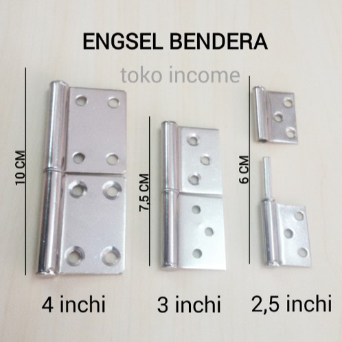 Deskripsi Engsel Cabut Bendera 4"Digunakan untuk engsel pintu kayu yang bisa di bongkar pasang.Harga perp