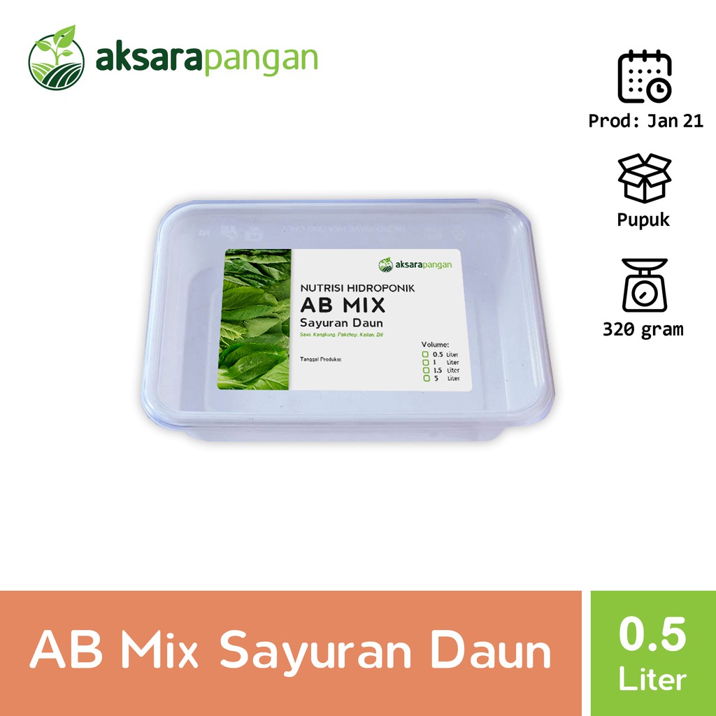 Nutrisi Hidroponik AB Mix dari Aksara Pangan adalah Nutrisi yang diracik dan diformulasikan untuk budidaya pertanian hidroponik terutama sayuran daun. Nutrisi ini mengandung unsur makro dan unsur mikro yang penting untuk memenuhi kebutuhan nutrisi pada pertumbuhan tanaman hidroponik.Keunggulan:1. Mengandung unsur makro (N, P, K, Ca, Mg, dan S) dan unsur mikro (Fe, Mn, B, Zn, Cu, dan Mo).2. Mudah diserap untuk memenuhi kebutuhan nutrisi bagi tanaman.3. Bahan-bahan 100% larut dalam air.4. Tidak menyumbat sistem irigasi tetes.Jenis Sayuran:- Kangkung- Sawi- Pakcoy- Selada- Kale- Bayam- dan sayuran daun lainnyaKeterangan:- Petunjuk cara membuat larutan/pekatan stok ada didalam kemasan.- Tidak ada kadaluarsa, selama tidak berubah bentuk, warna, tekstur, dsb.- Pastikan disimpan di suhu ruangan, tidak lembab dan tidak terkena sinar matahari.Selamat berk